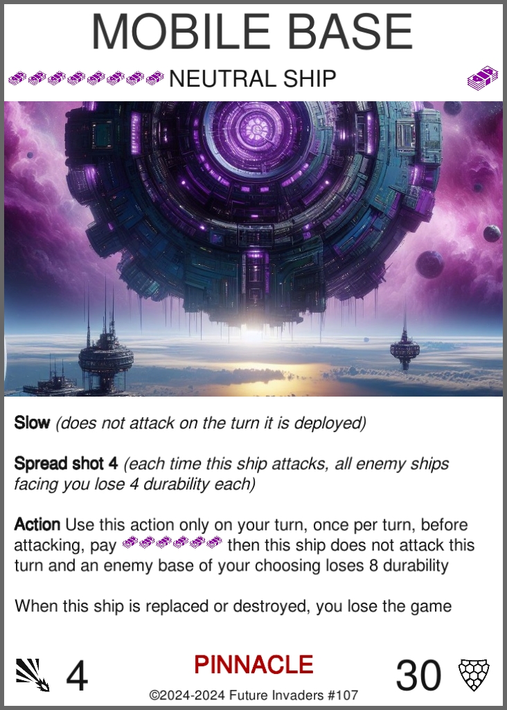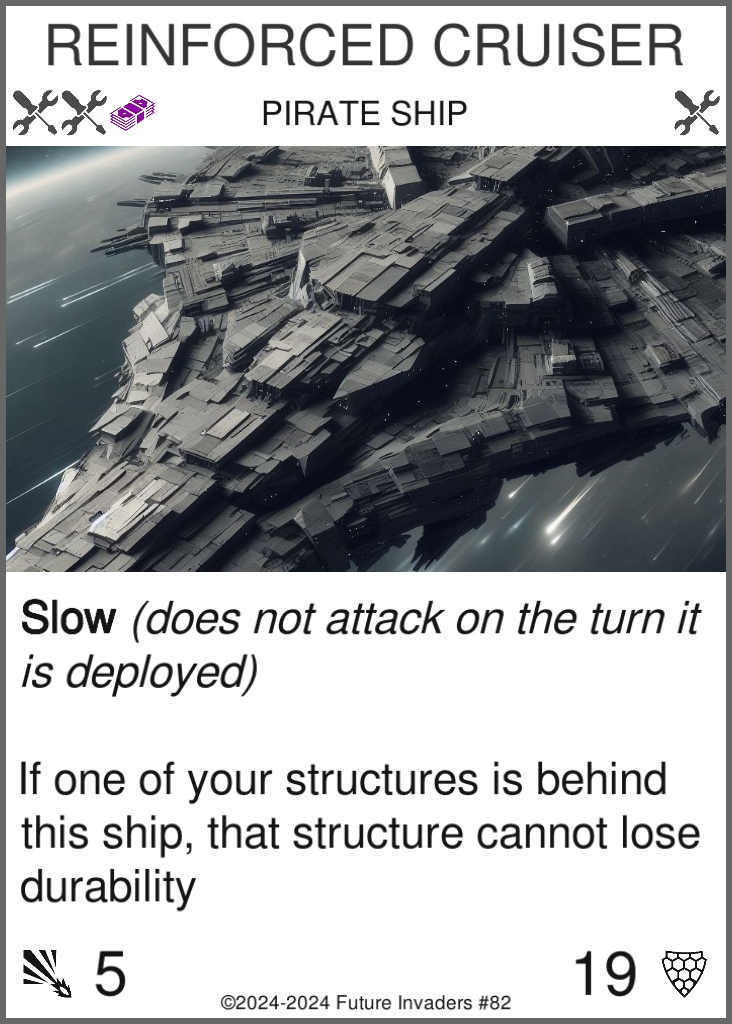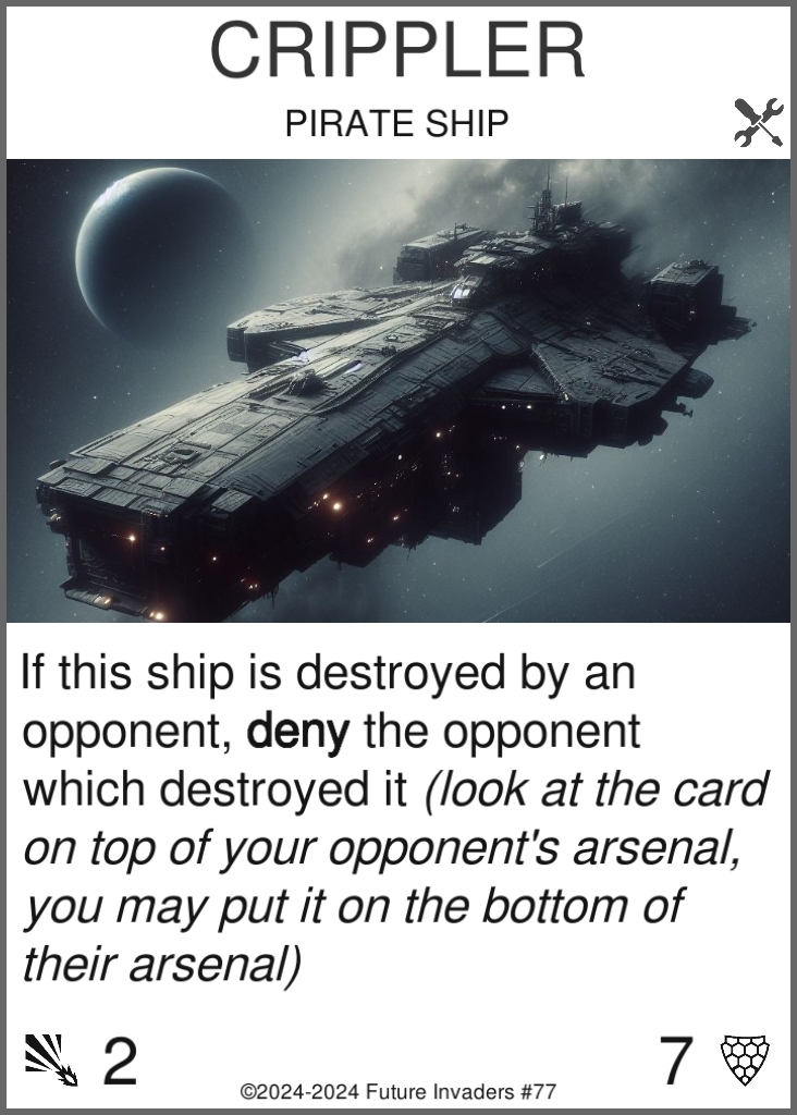 Ship: One of four possible card types. Once you pay their cost, ships are deployed on your side of the grid, in the front row. Ships can only be deployed during your turn. They attack once in front of them on each of your turns. When their durability drops to zero or below, ships are destroyed.