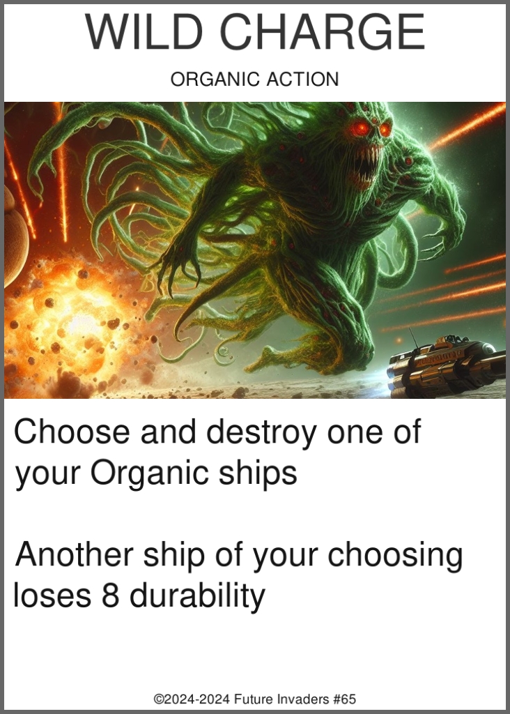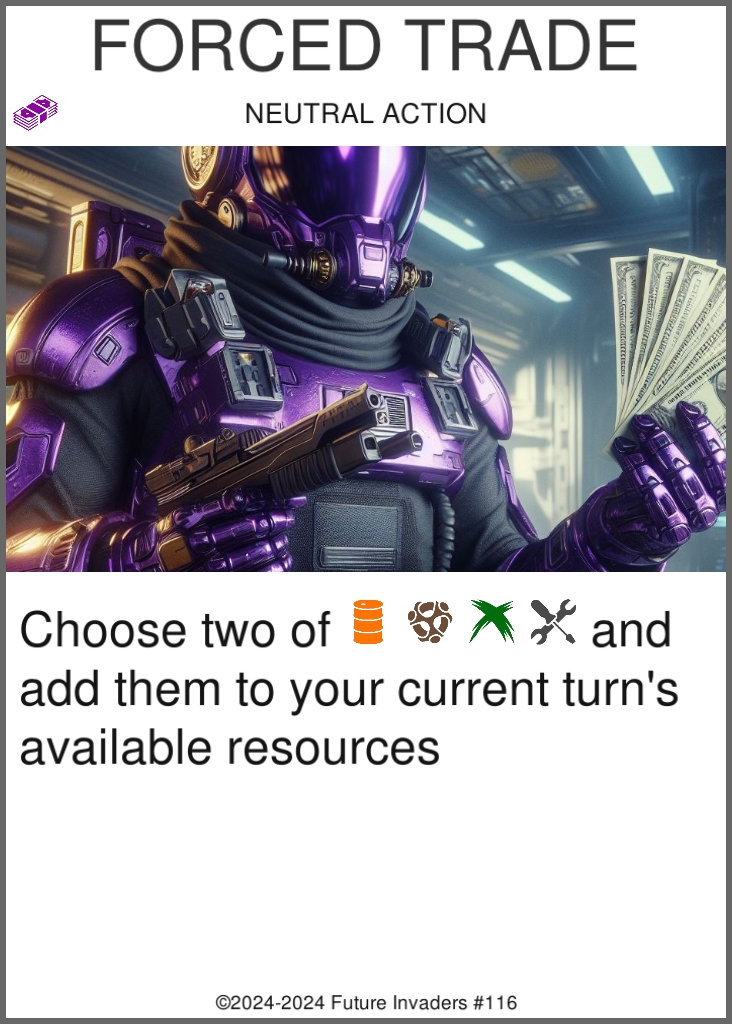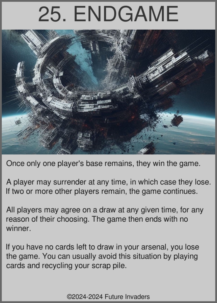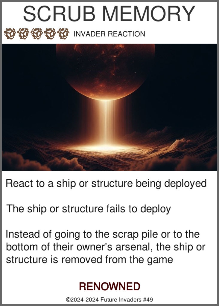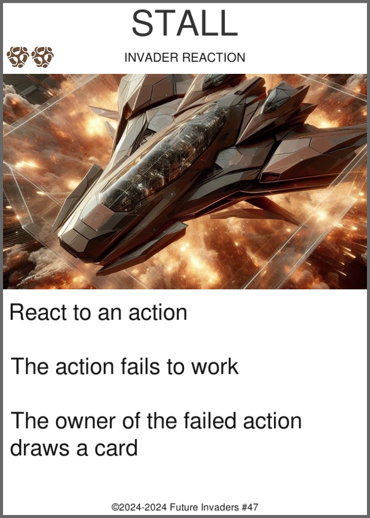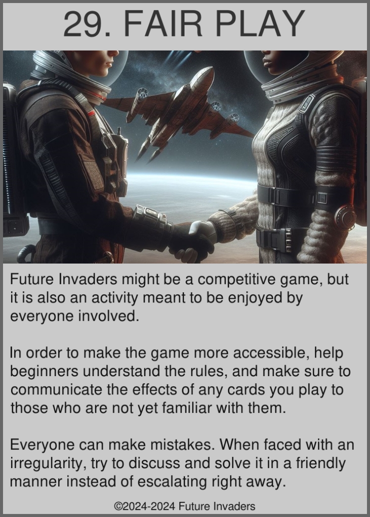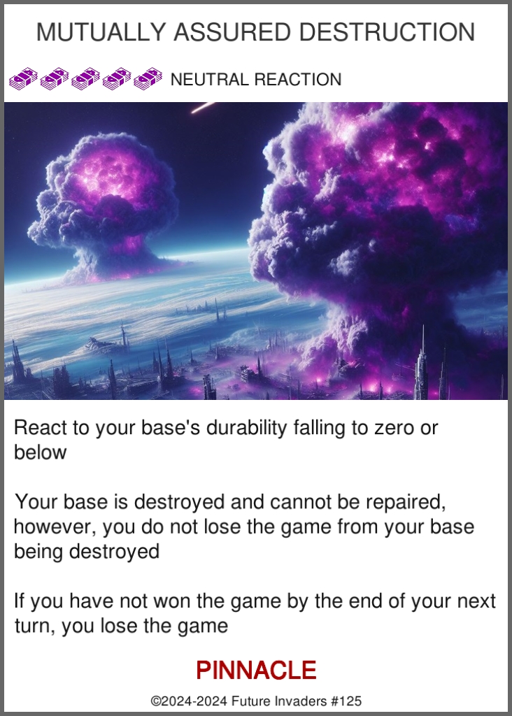 Some aspects of other complex card games lead to "unfun" situations, such as being forced to discard cards from your hand, being on the wrong end of a turn one combo, or losing a game due to being starved of resources. Future Invaders includes some strict design restrictions, forbidding certain mechanics and interactions in order to ensure that even losing can be a fun experience.