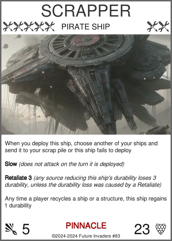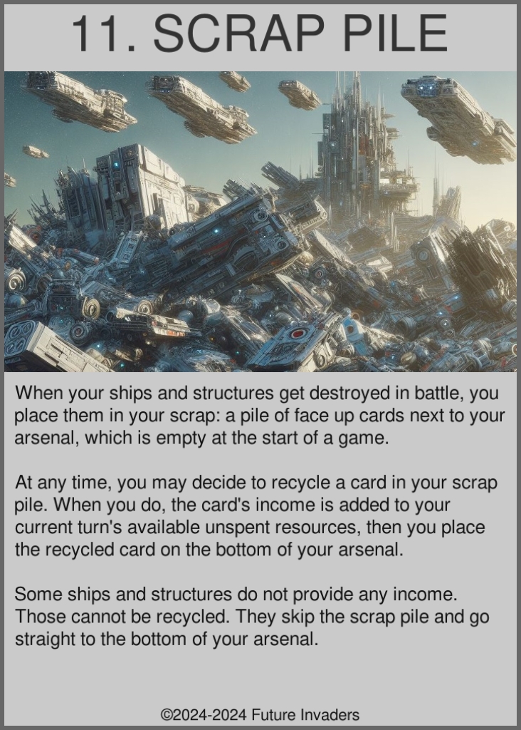Scrap pile: A pile of cards facing up, empty at the start of a new game. When one of your ships or structures is destroyed, if it has an income value, it goes into your scrap pile. Otherwise, it goes to the bottom of your arsenal. Cards in your scrap pile can be recycled at any time of your choosing.