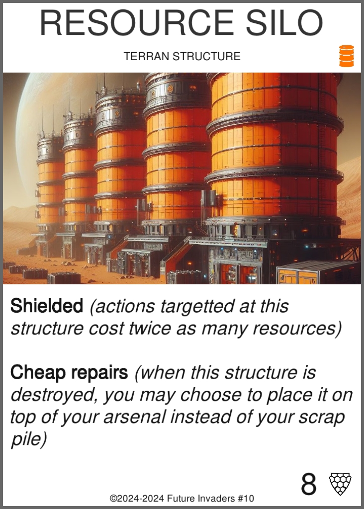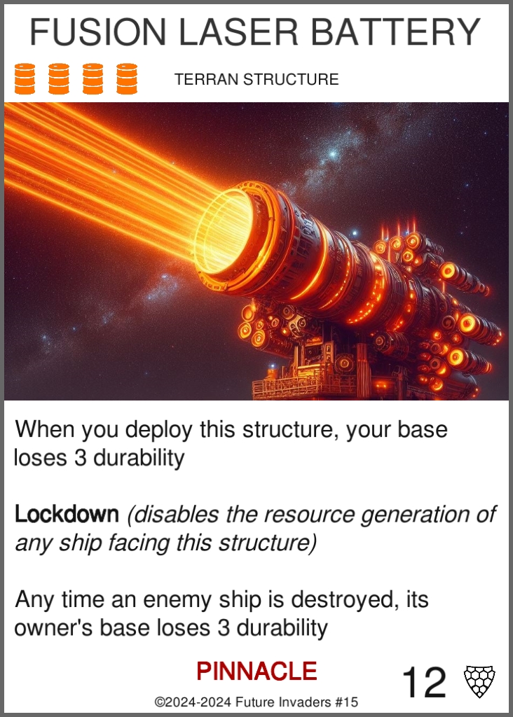 Structure: One of four possible card types. Once you pay their cost, structures are deployed on your side of the grid, in the back row. Structures can only be deployed during your turn. Structures do not attack. When their durability drops to zero or below, structures are destroyed.