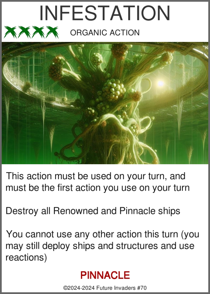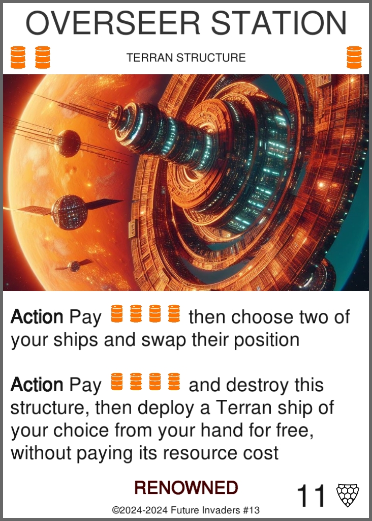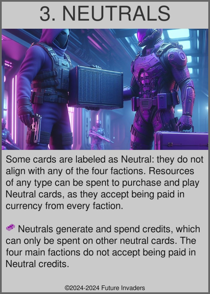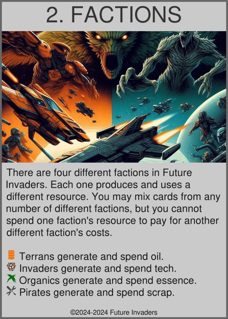Faction: Card families sharing a common resource type, design identity, and visual identity. There are four main factions (Terran, Invader, Organic, Pirate), along with a fifth Neutral faction.