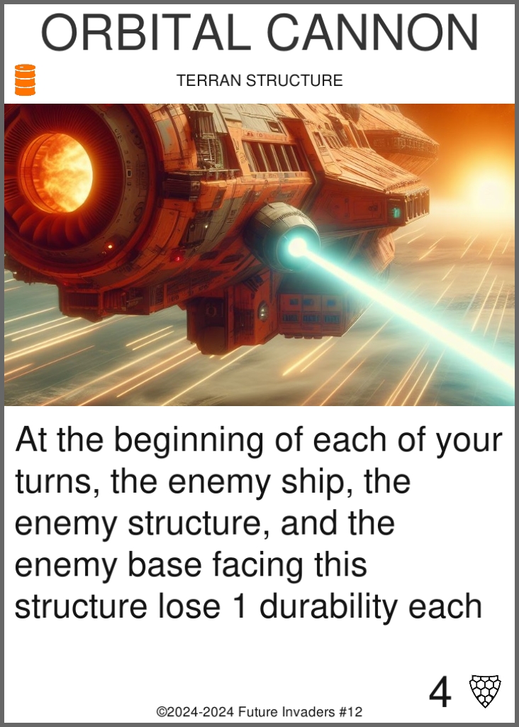 Orbital Cannon has physical flavor: the player feels like they deployed an actual heavy cannon on the board, which shoots in a line in front of it once per turn.