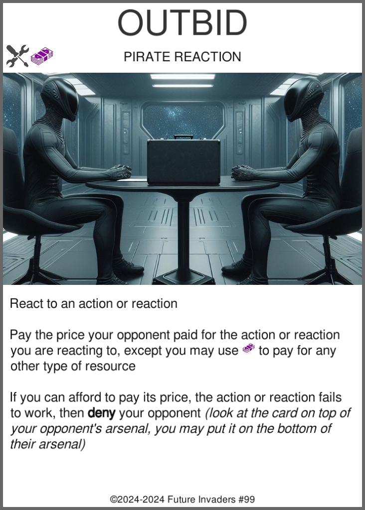 Outbid has interactive flavor: the player feels like they used their wealth to buy a mole in their opponent's base, and gets to deny an element of their arsenal in the process.