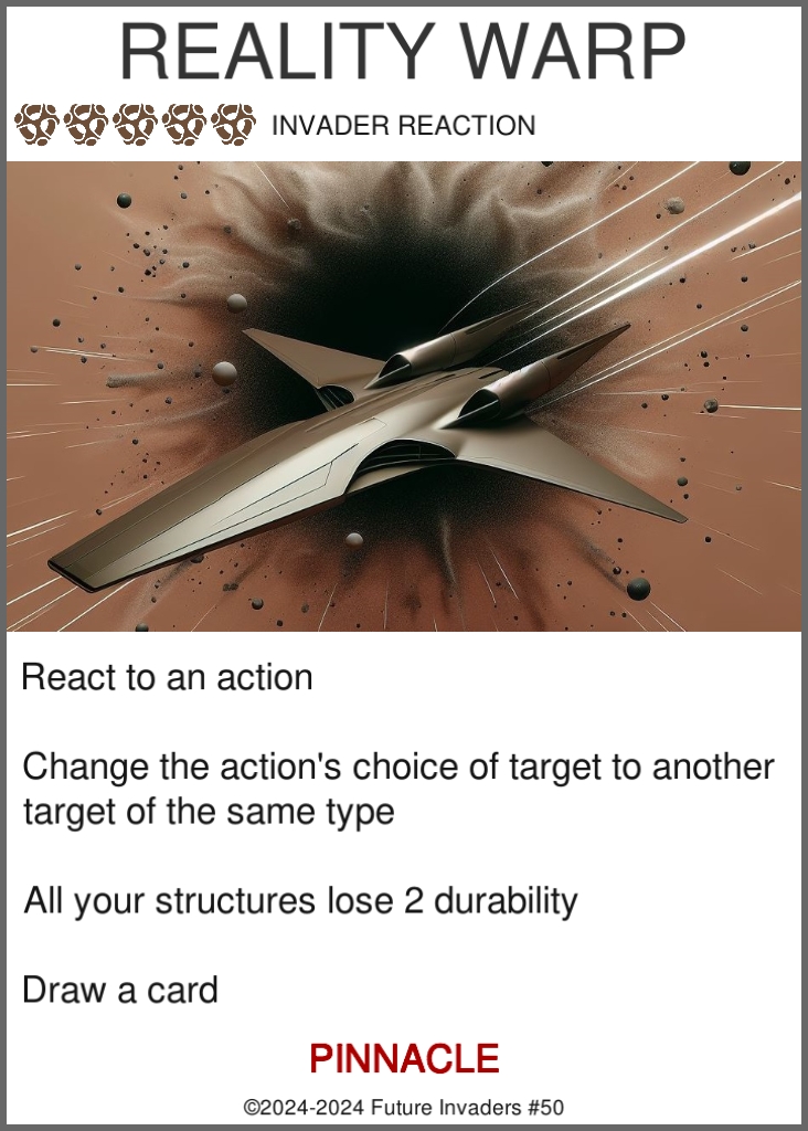 Reality Warp has power fantasy flavor: the player feels like they pushed the boundaries of physical reality so far that it expended a lot of resources while damaging their own material, but the risk is worth it when it lets them alter the game's world.