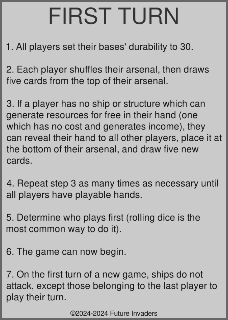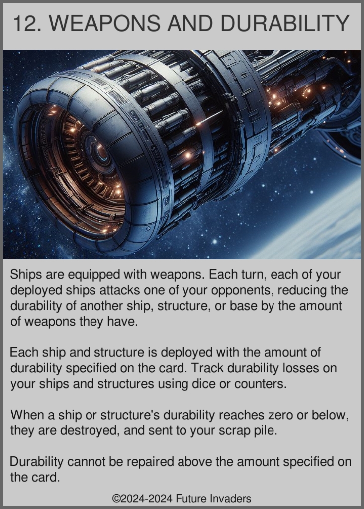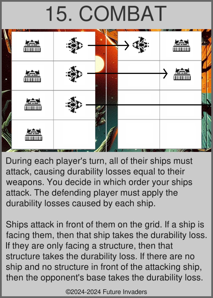 Attack: Each deployed ship must attack once during each of its owner's turns. When a ship attacks, it deals as much damage as it has weapons to whatever it is facing on the grid (either an enemy ship, an enemy structure, or an enemy base). Attacked ships, structures, and bases, do not retaliate, they simply take the damage.