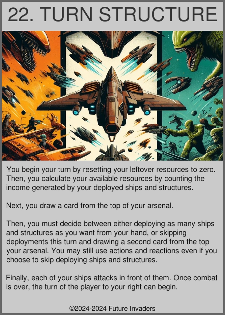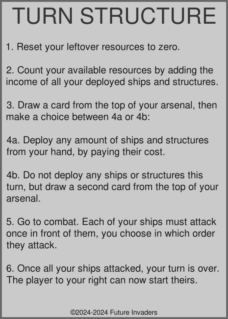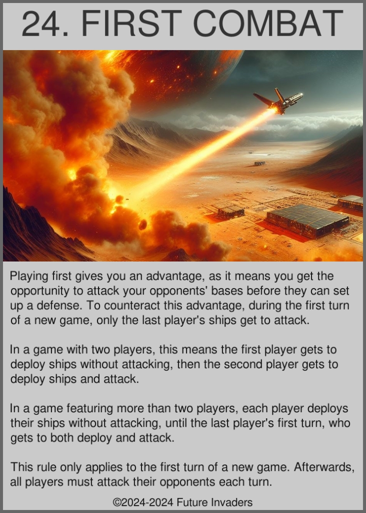 Combat: When all your deployed ships must attack in front of them. Combat happens once per turn. On the first turn of a new game, there is no combat, except for the last player to play their turn.