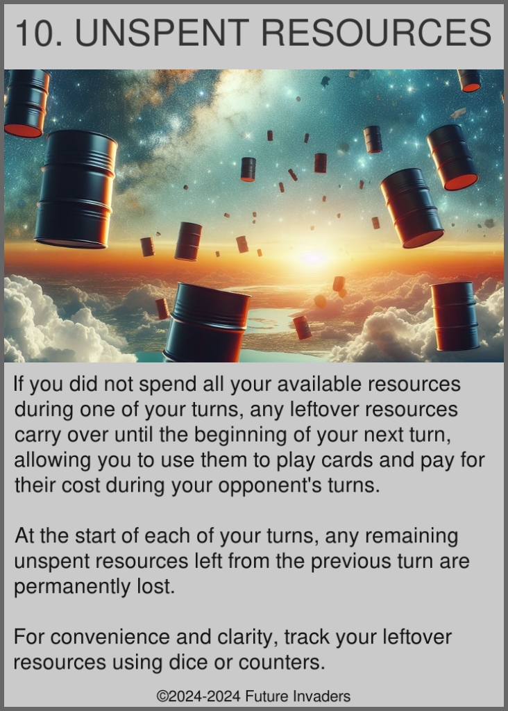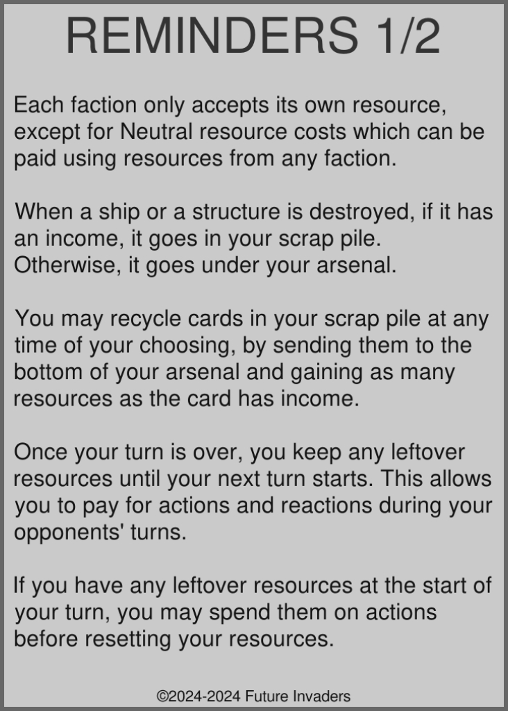 Resource: Currency required to use or deploy cards. Each faction produces and uses its own unique resource, except for Neutrals who also produce their own resource, but can pay their card costs using resources from any faction. At the start of each of your turns, your resources are reset to zero, then each deployed ship and structure adds their income to your resource pool. You keep this resource pool until the start of your next turn, allowing you to play actions and reactions during your opponents' turns.