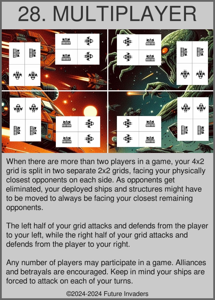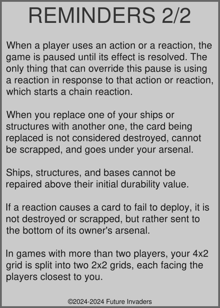 Grid: The game area on which ships and structures are deployed. Each player has a 4x2 grid in front of them. The back row has room for four structures, the front row has room for four ships. In 1v1 matches, both players' grids face each other. In matches with more than 2 players, each player's grid is split in the middle in two 2x2 halves, with the left half facing the half-grid of the player closest to their left, and the right half facing the half-grid of the player closest to their right. These half-grids are moved around as players are eliminated from the game, until only two players remain and their grids fuse back into 4x2 grids facing each other.