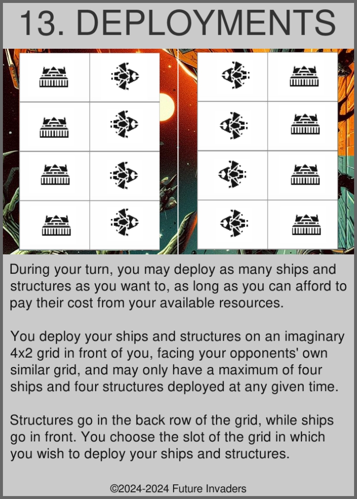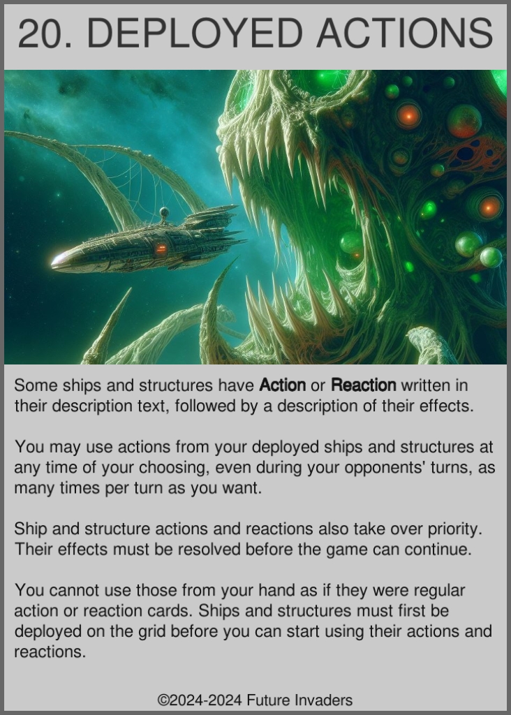 Deploy: Pay the cost of a ship or a structure, then place it on your side of the game grid. The effects listed in the descriptions of ships and structures only work while they are deployed.