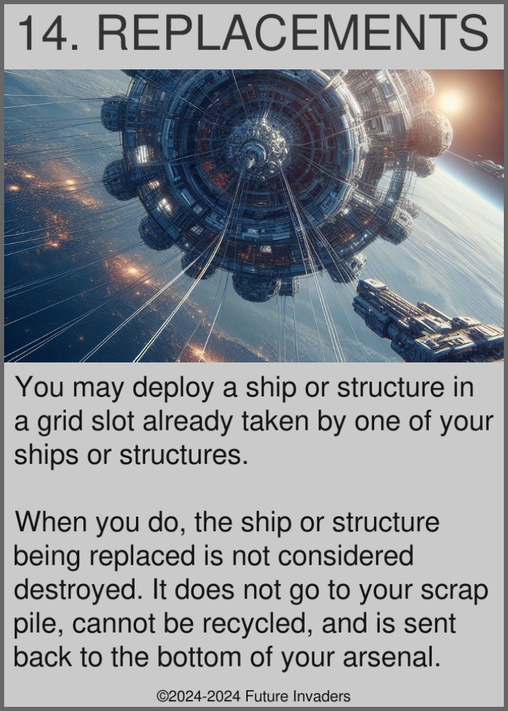 Replace: Deploy a ship or a structure on a grid slot that already has a ship or structure deployed. The ship or structure being replaced is not destroyed, it does not go to your scrap pile, it is sent straight to the bottom of your arsenal.