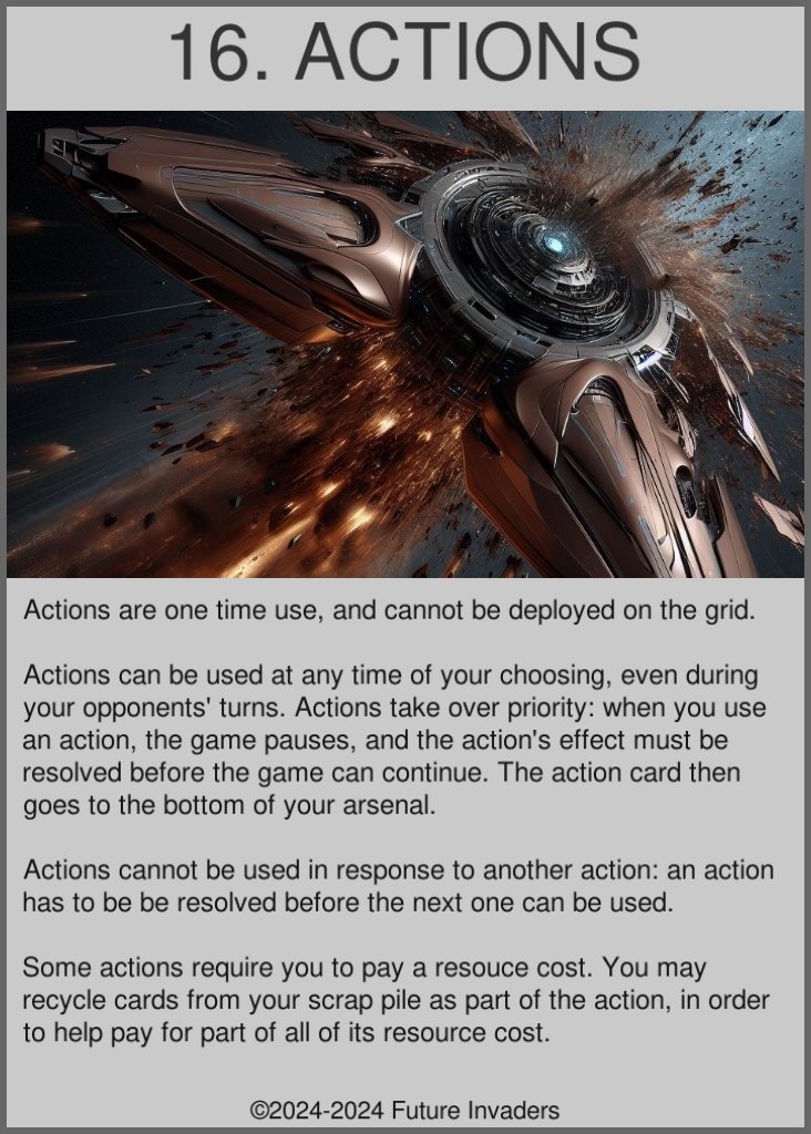 Action: One of four possible card types. Has a one-time use effect, then is placed at the bottom of its owner's arsenal. Can be used at any time, even during other players' turns. You may recycle cards in your scrap pile to help pay the price of an action. Actions take over priority: they pause the game, and must be resolved before the game can resume. You may not play actions in response to other actions or reactions, you must wait for them to be resolved before you can play your own action. If two actions are played at the same time, the player with priority plays their action first.