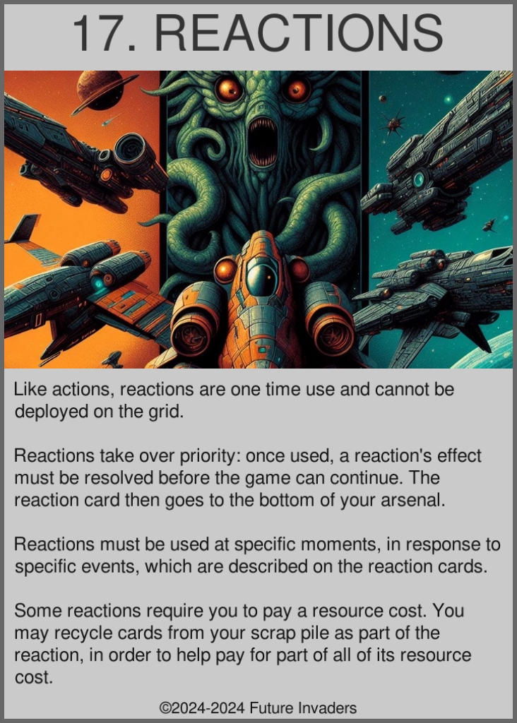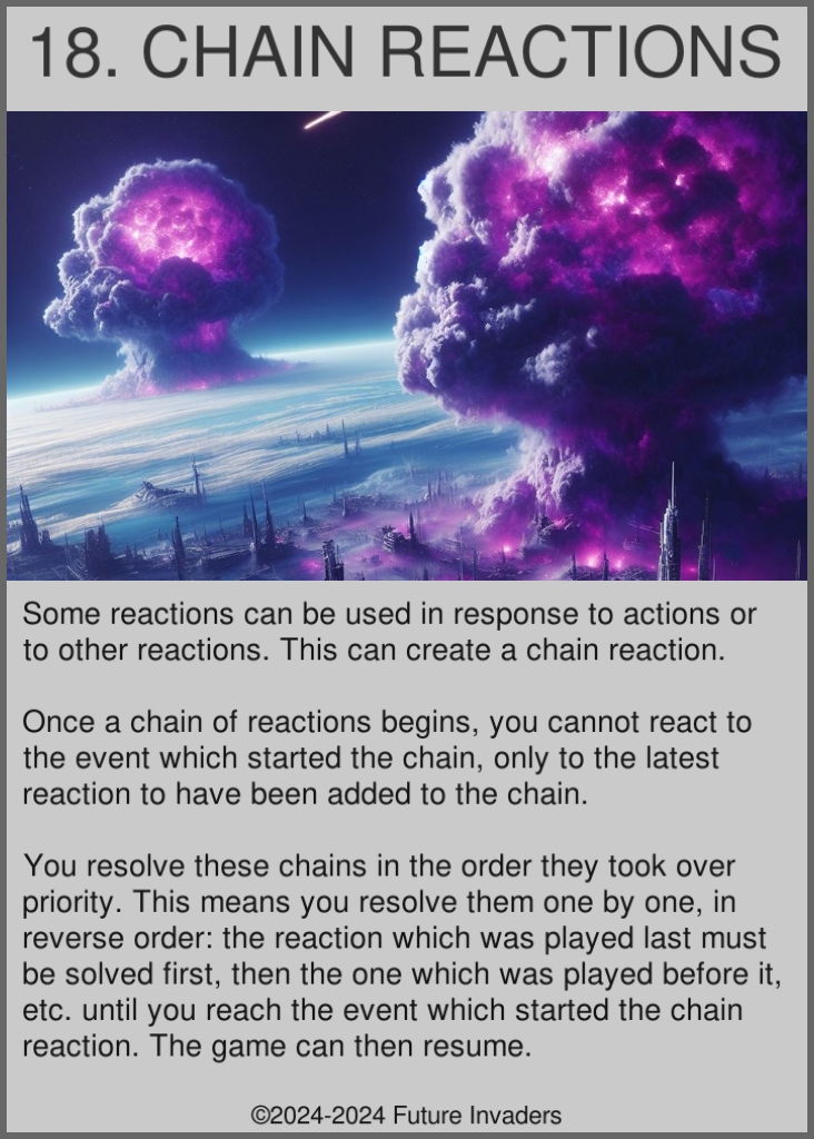 Reaction: One of four possible card types. Has a one-time use effect, then is placed at the bottom of its owner arsenal. They can only be used in response to specific events, which are specified in the card's description. You may recycle cards in your scrap pile to help pay the price of a reaction. Reactions take over priority: they pause the game, and must be resolved before the game can resume. Chains of reactions can happen, in which case you resolve them one by one, from the last one to be played until you reach the first event which started the chain. If two reactions are played at the same time, the player with priority plays their reaction first.