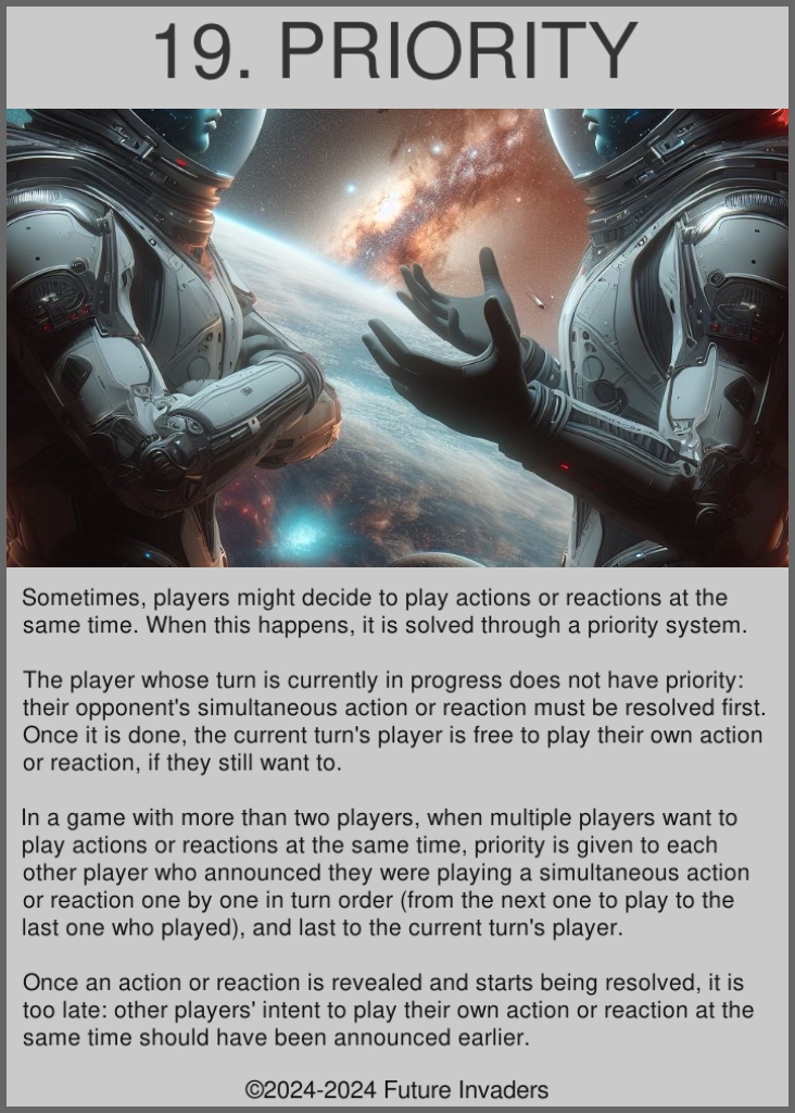 Priority: When two or more players want to play actions or reactions at the same time, priority is used to determine in which order these actions or reactions are played. Priority is first given to the next player in turn order, then goes around the table until it reaches the player who last played their turn, and finally the player whose turn is currently ongoing goes last.
