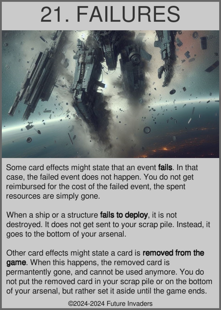 Fails: When an effect fails, it is denied, and does not happen. Resources spent on the effect are permanently lost. If a ship or a structure fails to deploy, it is not destroyed or scrapped, but instead goes straight to the bottom of your arsenal. Resources you spent on deploying them are permanently lost.