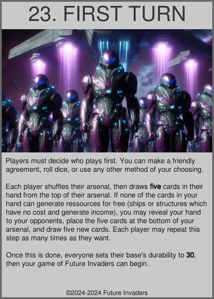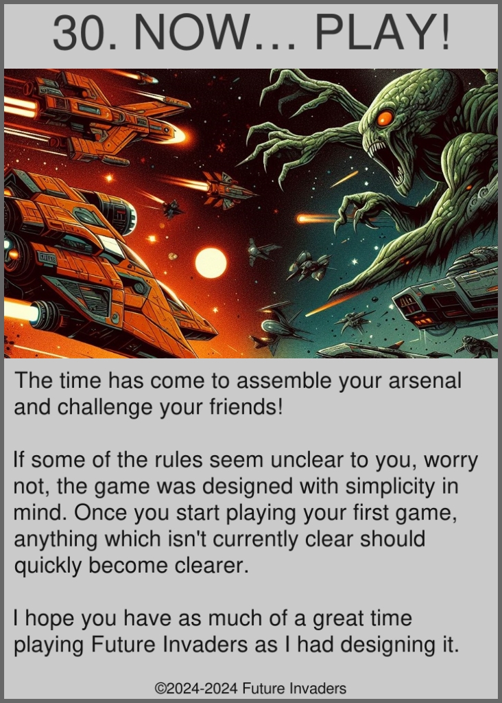 Playtesters on their second ever game ever of Future Invaders use standard pre-assembled Terran, Organic, and Pirate arsenals. This showcases how only one game is enough to understand most of the game's rules, even the intricate ones, and demonstrates how games between more than two players are played.