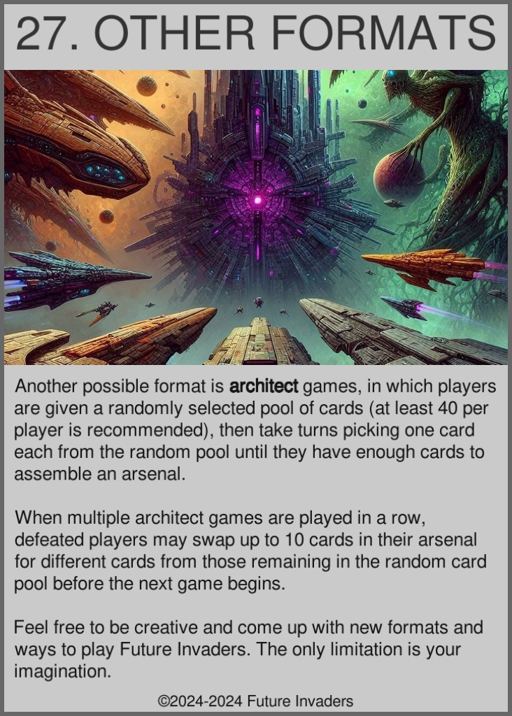 Format: Ways to play the game. The default format is prepared games, in which arsenals are assembled in advance. A common alternate format is architect, in which all players draft cards from the same common pool of cards, then play with their selection of cards.