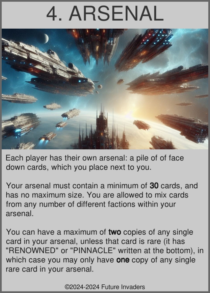 Arsenal: A player's deck of cards. Players shuffle their arsenals at the start of each game, and keep them next to themselves throughout the game, with the cards facing down, hidden from sight. Each player's arsenal must contain at least 30 cards, and no more than two copies of any card, or no more than one copy of any rare card (pinnacle or supreme). If you must draw a card, but there are no more cards left in your arsenal, you lose the game.