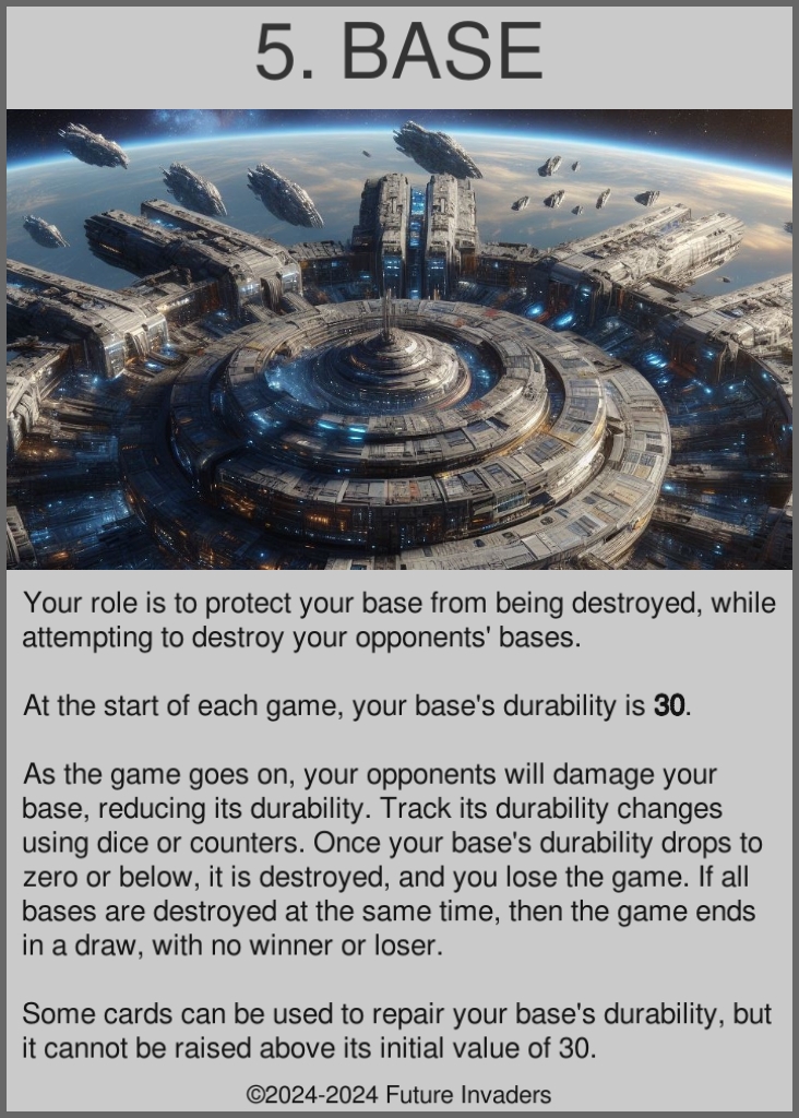 Base: A player's health pool. Each player's base starts the game at 30 durability. Bases cannot be repaired above 30 durability. When a base's durability drops to zero, it is destroyed, and its owner is eliminated from the game. Once only one base remains standing, its owner wins the game.