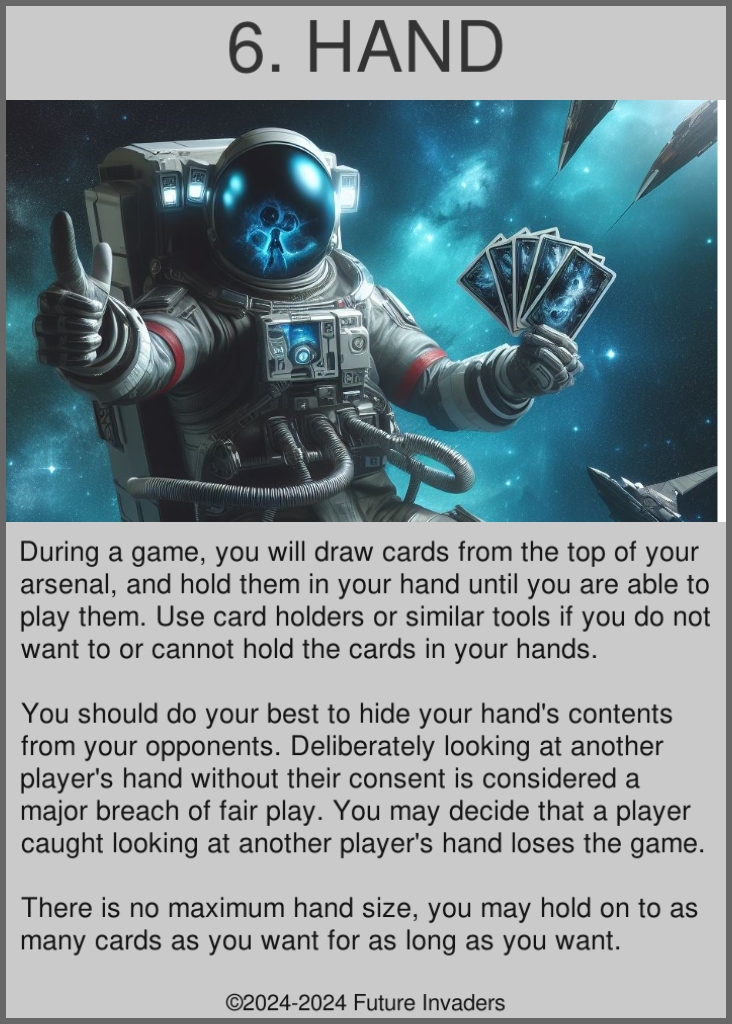 Hand: The cards you draw throughout the game are placed in your hand. Cards in your hand should ideally be kept hidden from your opponents' eyes. The cards in your hand are the only ones you may use or deploy. There is no maximum hand size.