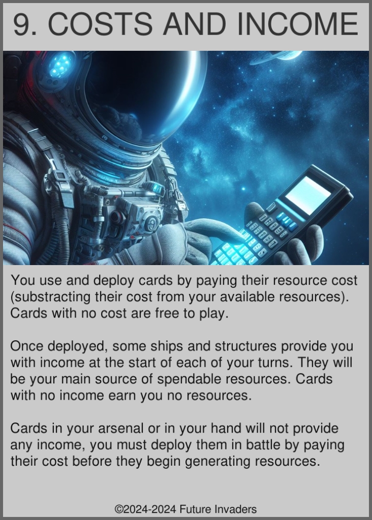 Income: The amount of resources generated by a deployed ship or structure at the start of each of your turns. Specified on the top right of ship and structure cards. Cards with no income value generate no resources.